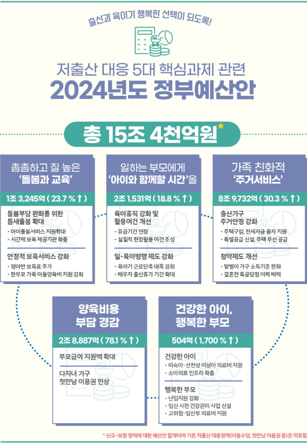 미래를 준비하기 위한 2024년 저출산 대응 예산안은 "출산과 육아가 행복한 선택"을 기반으로 작성되었습니다. 3월 28일 윤석열 대통령 주재로 열린 저출산고령사회위원회 제1차 회의에서 발표된 저출산 대응 정책의 5대 핵심과제(돌봄 및 교육, 일- parenting, 가족친화주택, 양육비 경감, 보건)에 따라 관련 예산을 증액하거나 사업 및 체계를 구축하는 데 중점을 두었습니다. 이에 따라 저출산 5대 핵심과제 2024년 예산은 15조 4천억 원(3월 28일 발표된 신·보충정책 예산 23조 3천억 원을 합한 금액이며, 기존 저출산 대응 정책 예산(아동수당, 첫만남권 등)은 포함되지 않았습니다. 윤 총장은 저출산고령사회위원회 제1차 회의에서 결혼과 출산, 양육이 행복한 선택이 될 수 있는 사회를 위해 일과 가정이 양립할 수 있는 환경을 조성한다는 구체적이고 명확한 정책 목표를 저출산 대응 방향의 핵심으로 설정하고, 정책의 실효성을 높이기 위해 관련 정책에 집중하겠다고 밝혔습니다. 내년 예산안에는 저출산 극복에 대한 중앙정부의 확고한 의지가 담겨 있다고 할 수 있습니다.